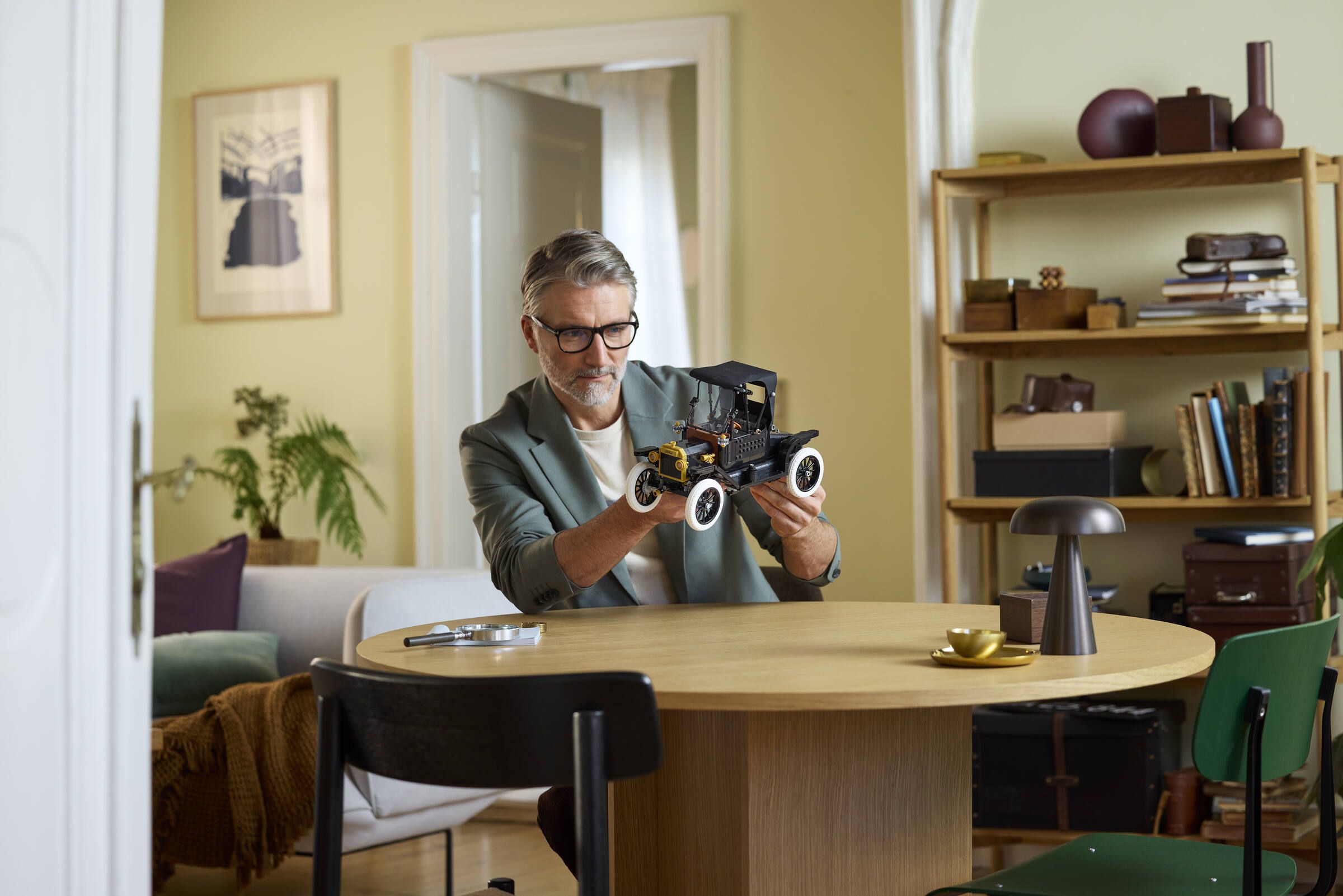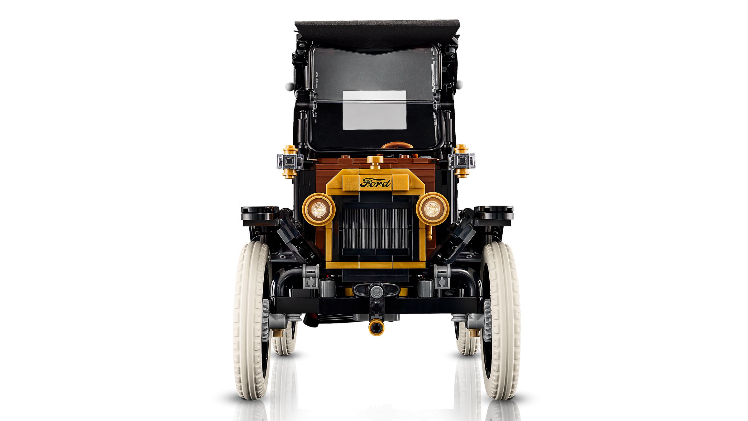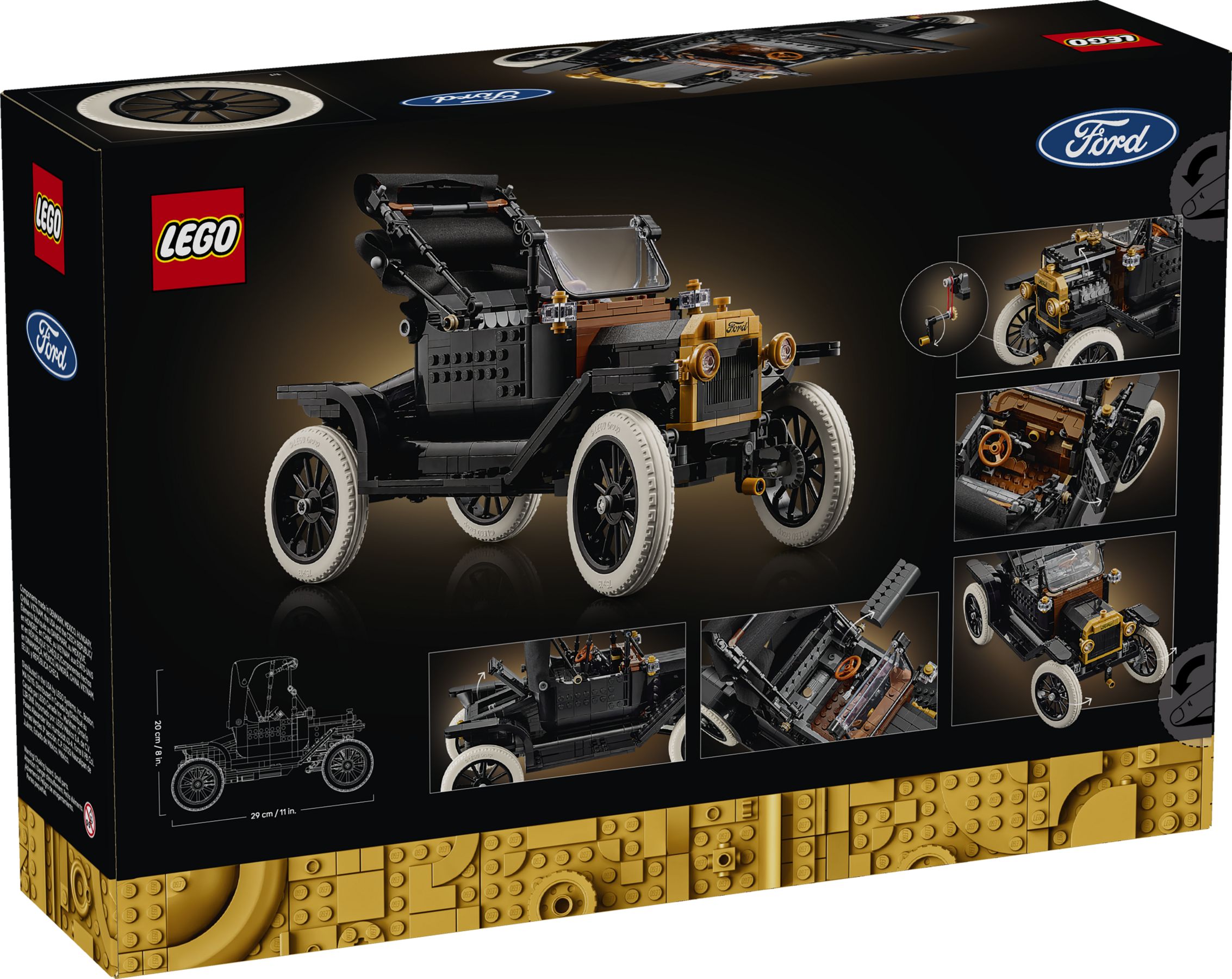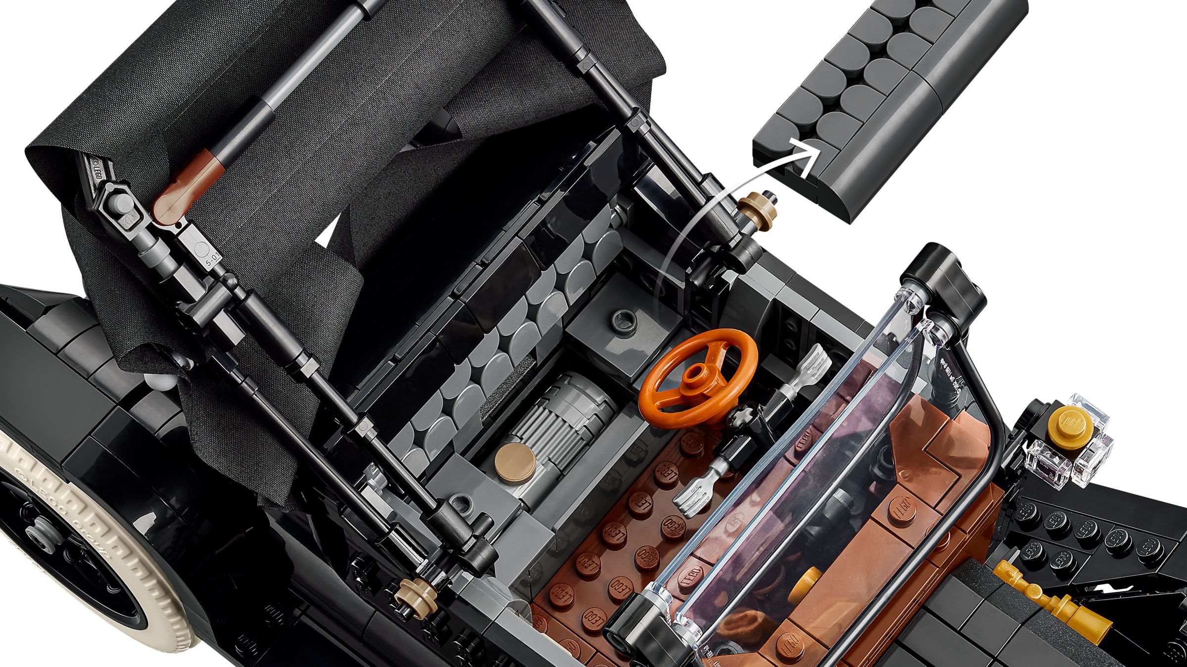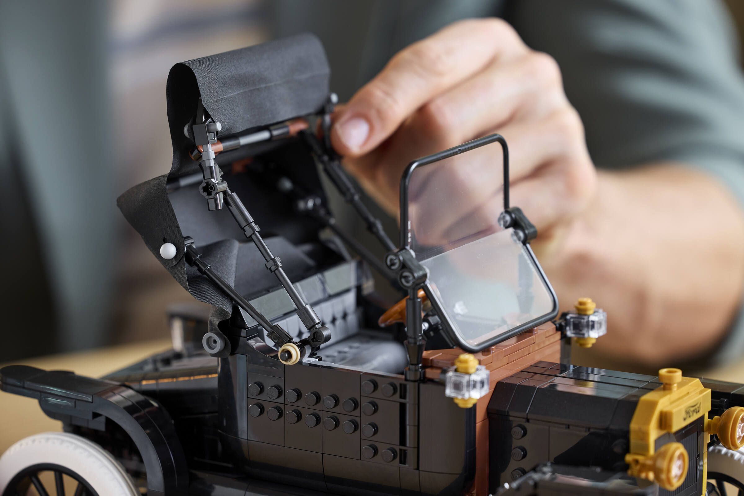 Schwarze Karosserie mit goldenen Akzenten, ein klappbares Stofffaltdach und eine umlegbare Windschutzscheibe – das Ford Model T der 1910er-Jahre steckt voller authentischer Details, darunter sogar eine per Kurbel drehbare Gebläseanlage unter der aufklappbaren Motorhaube. Der Bausatz umfasst 1.060 Teile, braucht etwa zwei bis drei Stunden und ist für Erwachsene ab 18 Jahren gedacht.