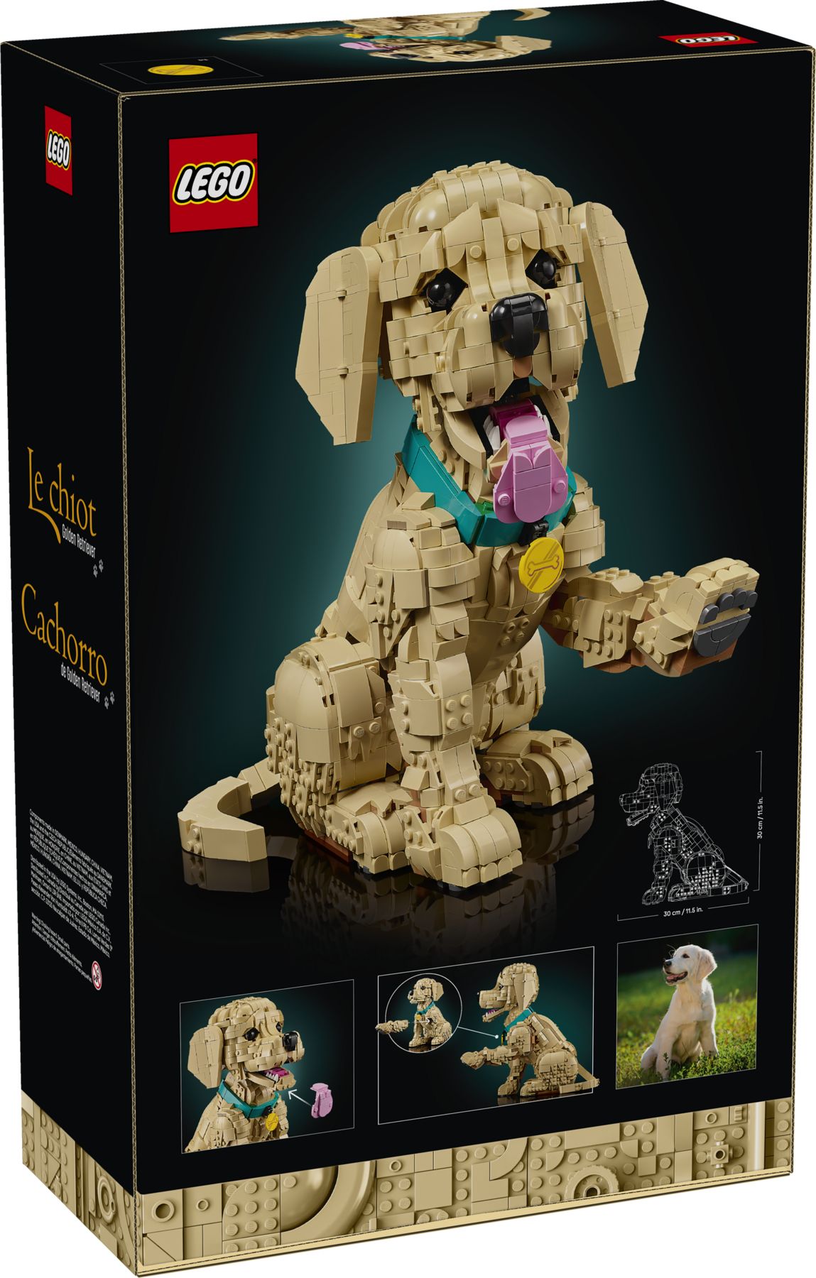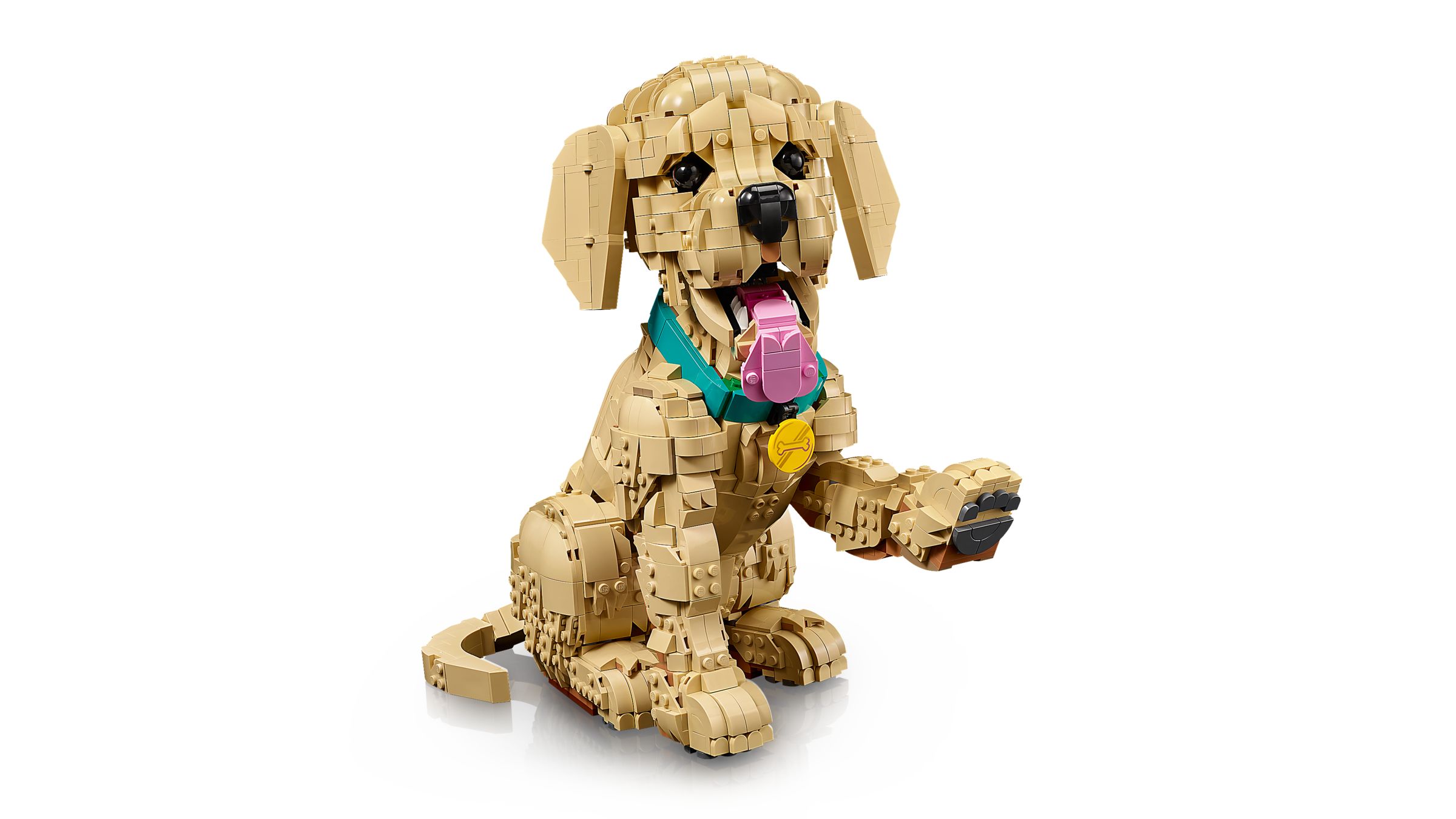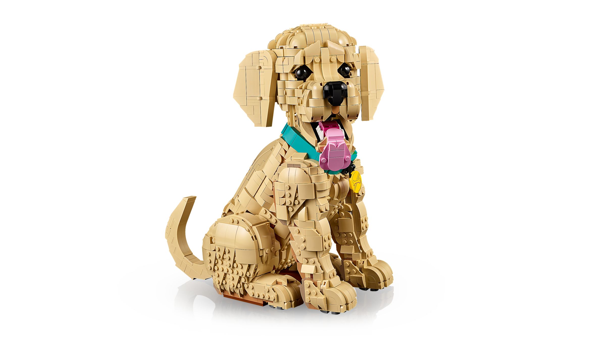Ein Golden Retriever im Welpenformat, dessen Kopf, Ohren, Schwanz und Pfoten beweglich sind – und beim Öffnen des Mauls kommen zwei Reihen Zähne samt rosaroter Zunge zum Vorschein. Das Modell umfasst 2.102 Teile, braucht etwa fünf bis sechs Stunden und ist als Bauprojekt für Erwachsene ab 18 Jahren konzipiert.