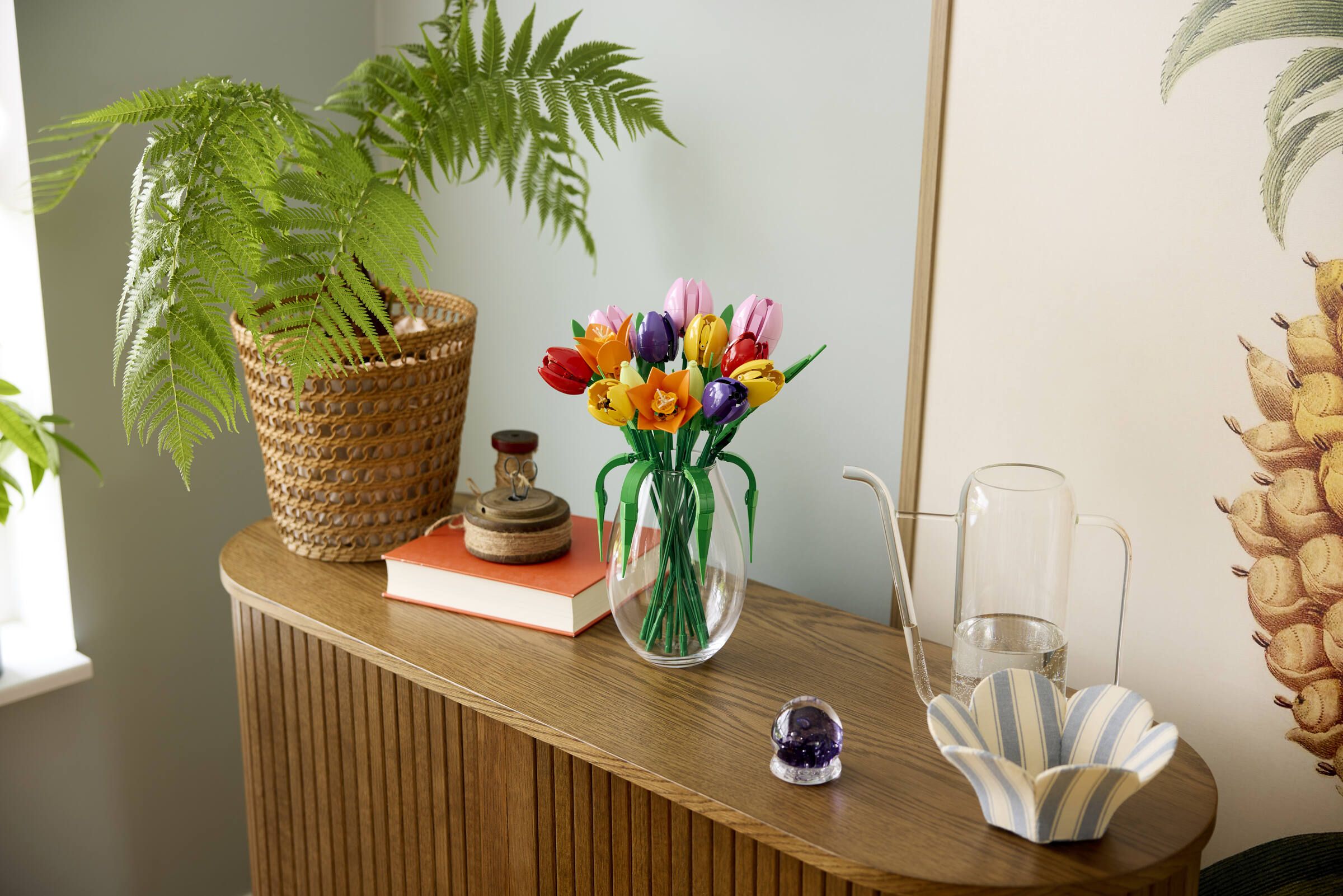 Erschaffe einen bunten LEGO® Tulpenstrauß und spüre, wie die Kreativität in dir auflebt. Baue jede Blüte und bestaune die Details und Farben. Du wirst grüne Knospen, geschlossene violette Blumen und offene Tulpen in Rot, Gelb und Rosa entdecken. Mit den anpassbaren Stängeln und den grünen Blättern verleihst du dem Strauß deine persönliche Note. Der fertige Strauß ist eine tolle Blumendeko, die du überall hinstellen kannst.