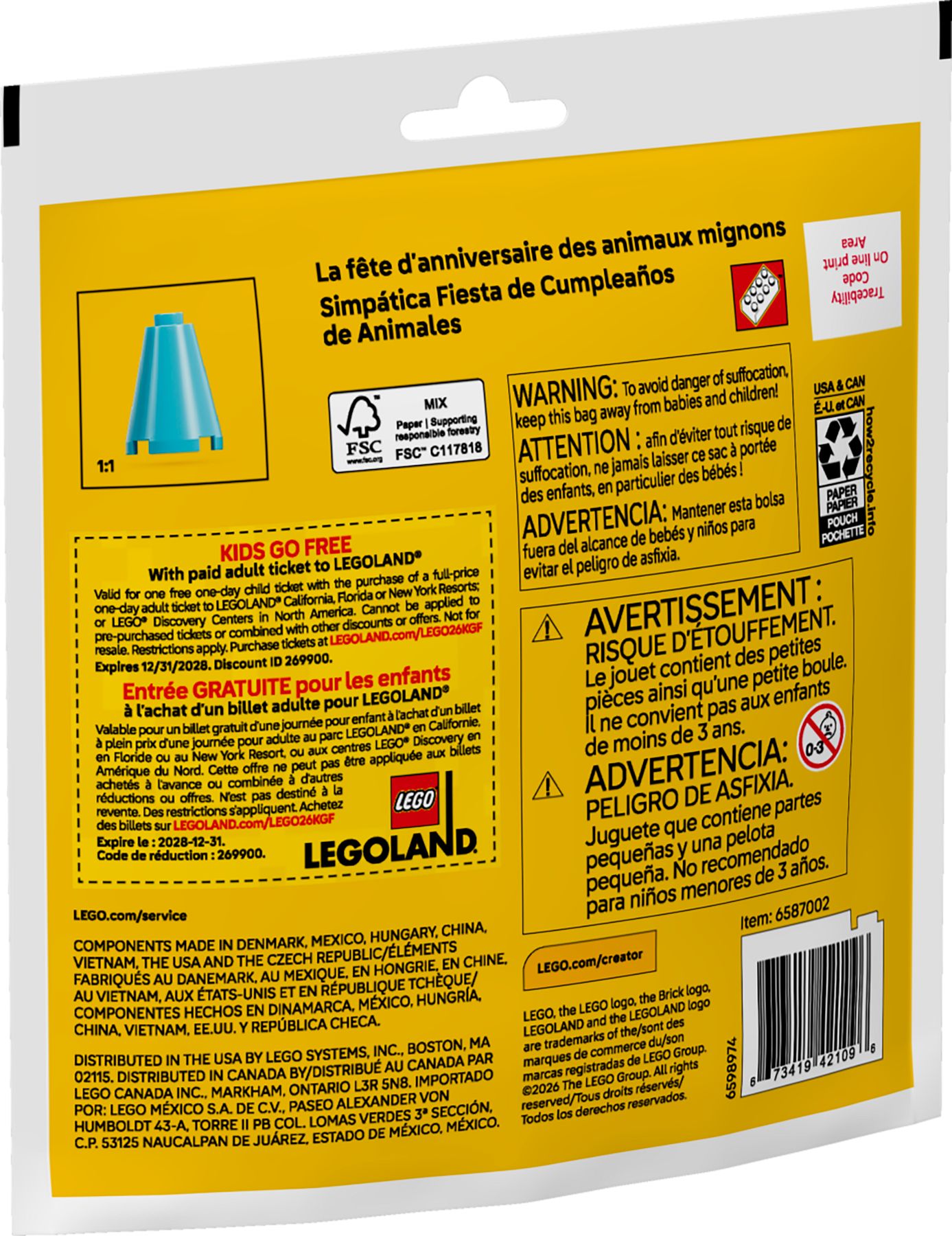 Flamingo und Löwe mit Partyhüten, eine mehrstöckige Torte und ein bunter Luftballon – dieses Polybag packt eine ganze Geburtstagsparty in 64 Teile. Das Modell eignet sich ab 6 Jahren als kleines Mitbringsel oder Ergänzung zur Creator-Sammlung.