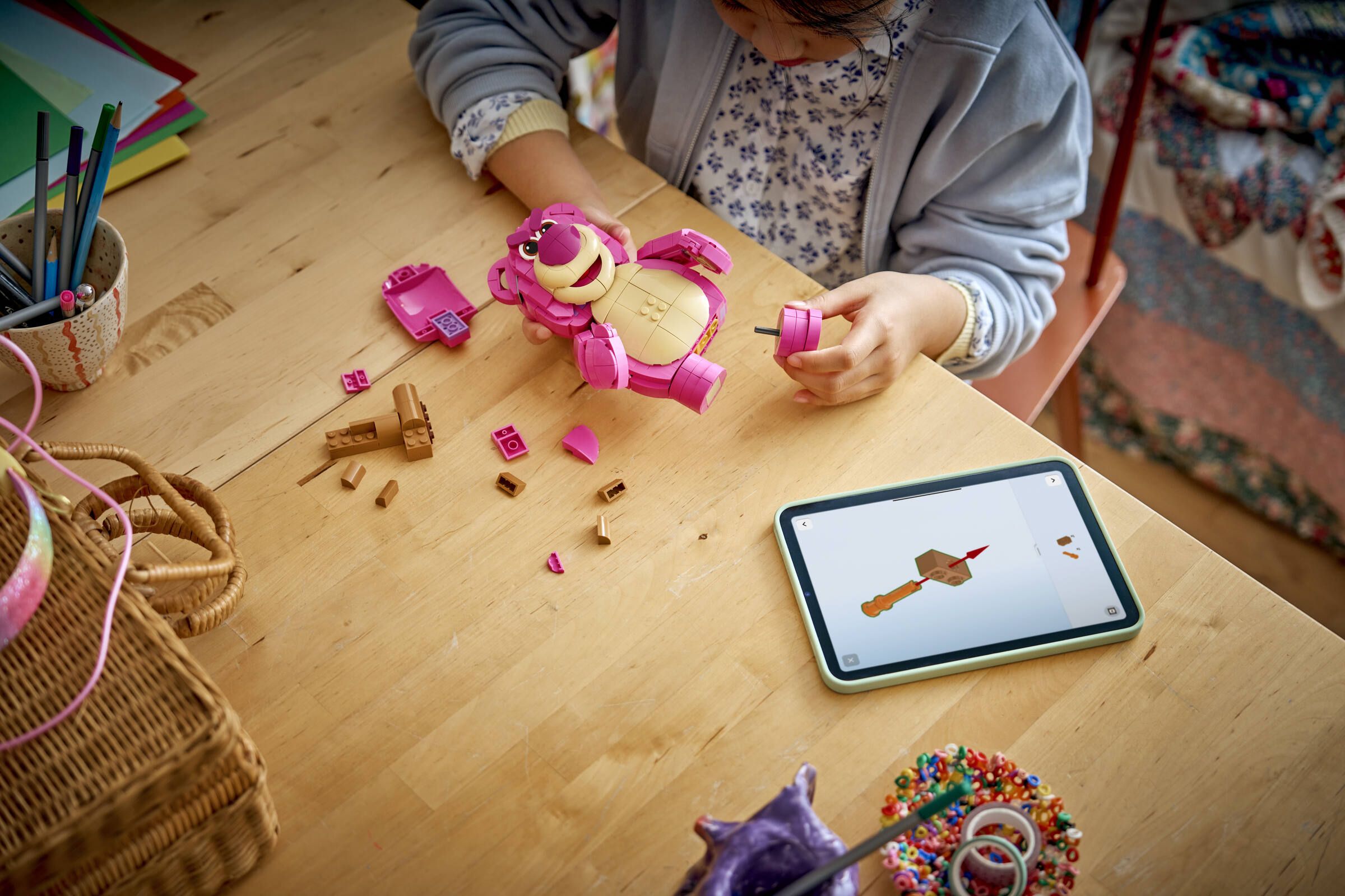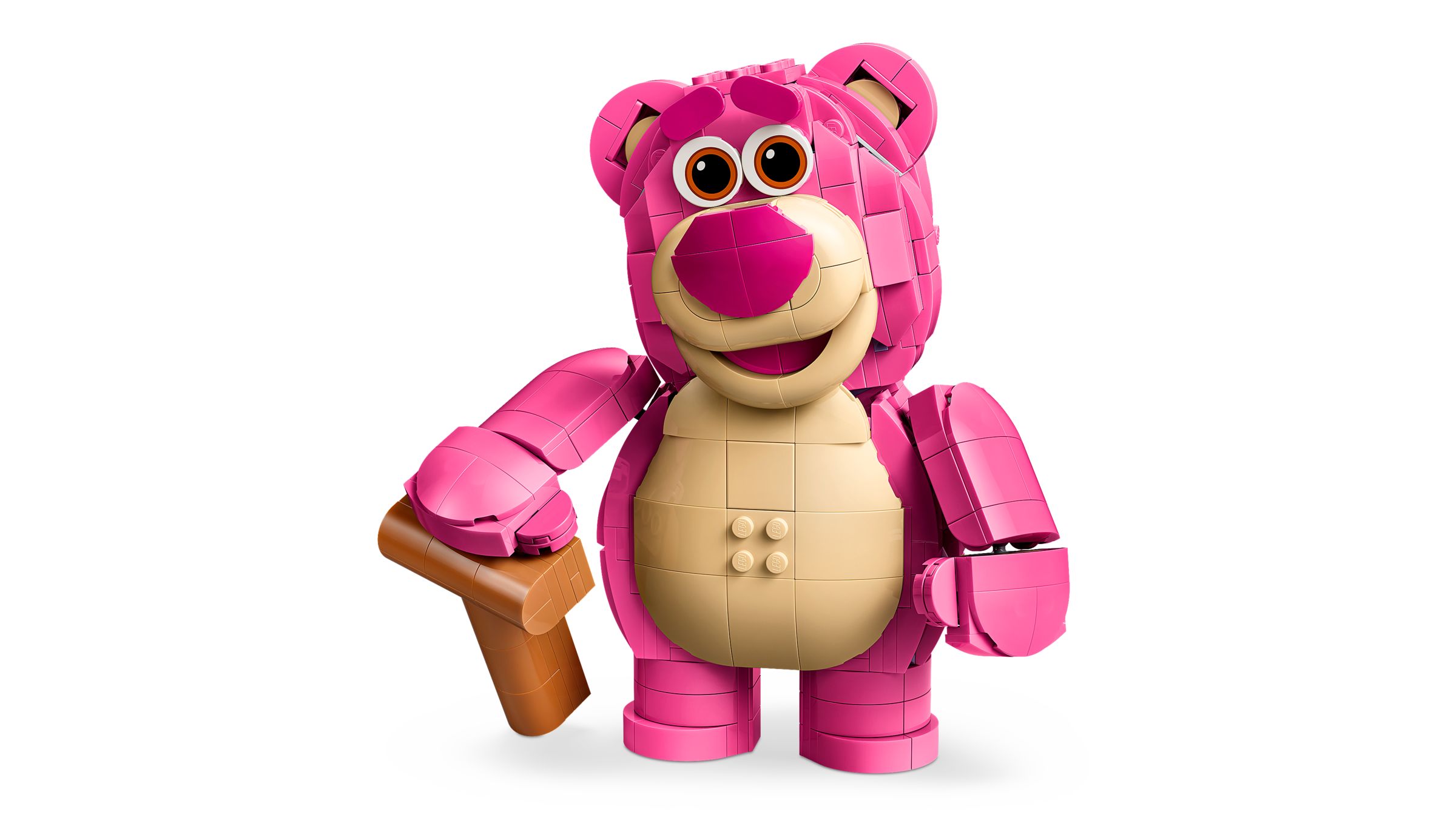 Der rosafarbene Erdbeer-Bär aus Toy Story 3 lässt sich als 16 cm große Figur mit beweglichen Armen, drehbaren Händen und veränderbarem Gesichtsausdruck aufbauen – inklusive Gehstock und versteckter Easter Eggs im Rücken. Das Modell umfasst 570 Teile, braucht etwa ein bis zwei Stunden und eignet sich für Kinder ab 9 Jahren sowohl zum Spielen als auch zum Ausstellen.