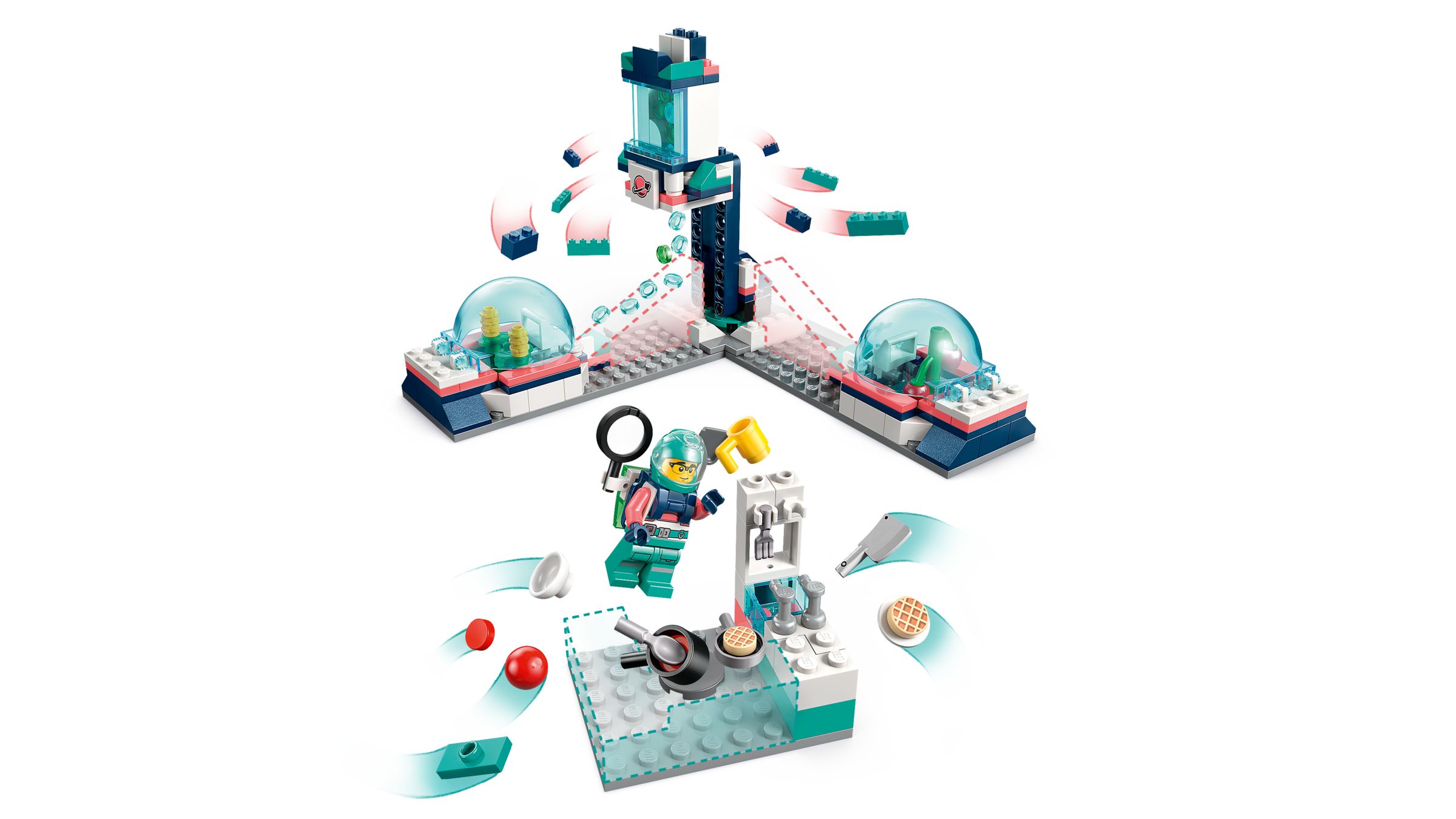 Raumschiff, Startrampe und Treibhaus – das Mondmissions-Set kombiniert Bauprojekt und Physikexperimente zu einem Lernpaket rund um die Raumfahrt. Der 519-teilige Bausatz für Kinder ab 8 Jahren enthält zwei Astronauten-Minifiguren und braucht etwa ein bis zwei Stunden zum Aufbauen.