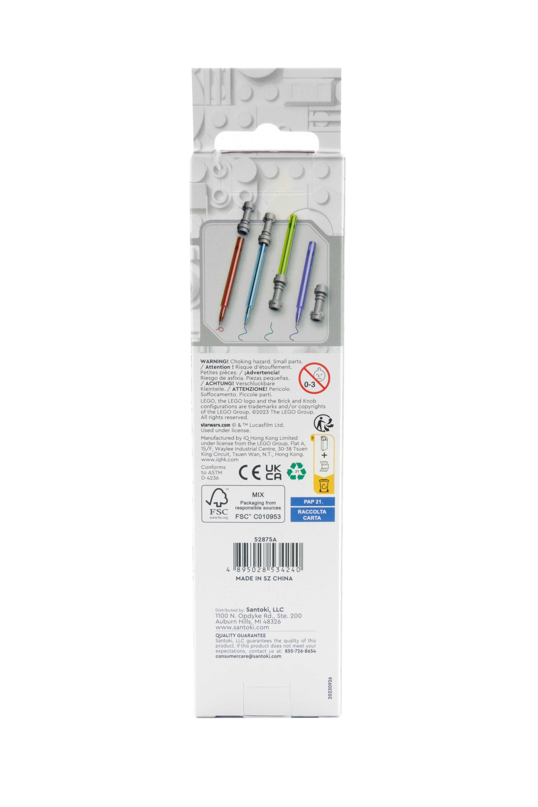 Vier Gelschreiber in Rot, Blau, Grün und Violett stecken in Gehäusen, die aussehen wie Lichtschwerter aus dem Star Wars-Universum – inklusive geformter Griffkappe. Das Set eignet sich für Fans ab 6 Jahren und kommt ohne Bauzeit aus, da die Stifte sofort einsatzbereit sind.