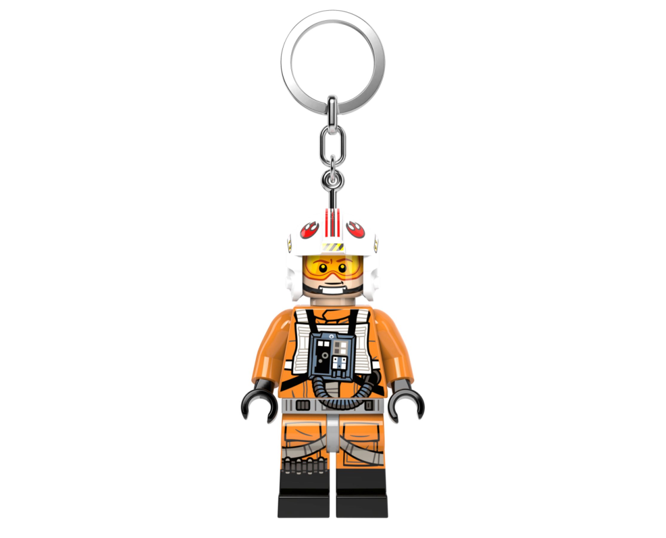 Luke Skywalker in Pilotenuniform hängt als große Minifigur am Schlüsselring – beweglich an Kopf, Armen und Beinen, mit zwei LEDs in den Füßen, die per Knopfdruck auf der Brust aufleuchten. Der Anhänger lässt sich an Schlüsseln, Taschen oder Rucksäcken befestigen und ist ein kompaktes Geschenk für Star-Wars-Fans ab 6 Jahren.