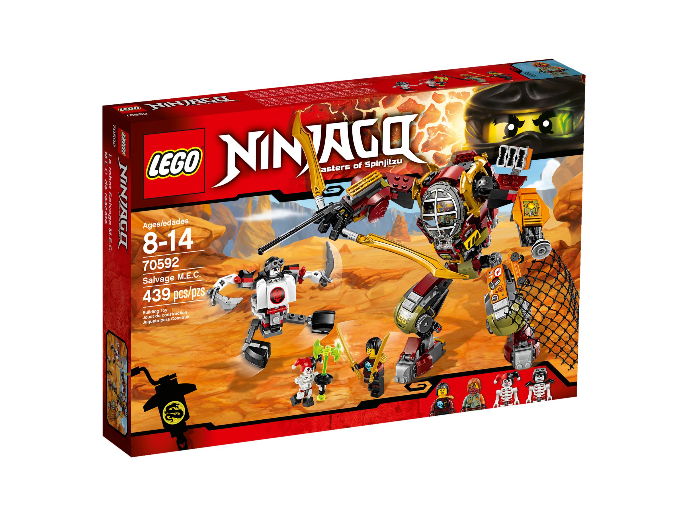 Das LEGO Set Schatzgräber M.E.C. mit der LEGO-Nummer 70592 Salvage M.E.C. gehört zur Themenreihe LEGO NINJAGO. Altersempfehlung: 8-14 Jahre. Dieser LEGO Baukasten ist 2016 erschienen und ist seit Ende Dezember 2017 offiziell aus dem LEGO-Programm (EOL = End of Life). Das Set enthält 4 Minifiguren. Das Modell besteht aus 439 Teilen. Die Bauzeit beträgt ca. 1 bis 2 Stunden. Die Teile des Sets ohne Anleitung und Box wiegen ca. 473 Gramm. Die LEGO-Box wiegt insgesamt ca. 580 Gramm. Die unverbindliche Preisempfehlung (UVP) liegt bei 39,99 €.