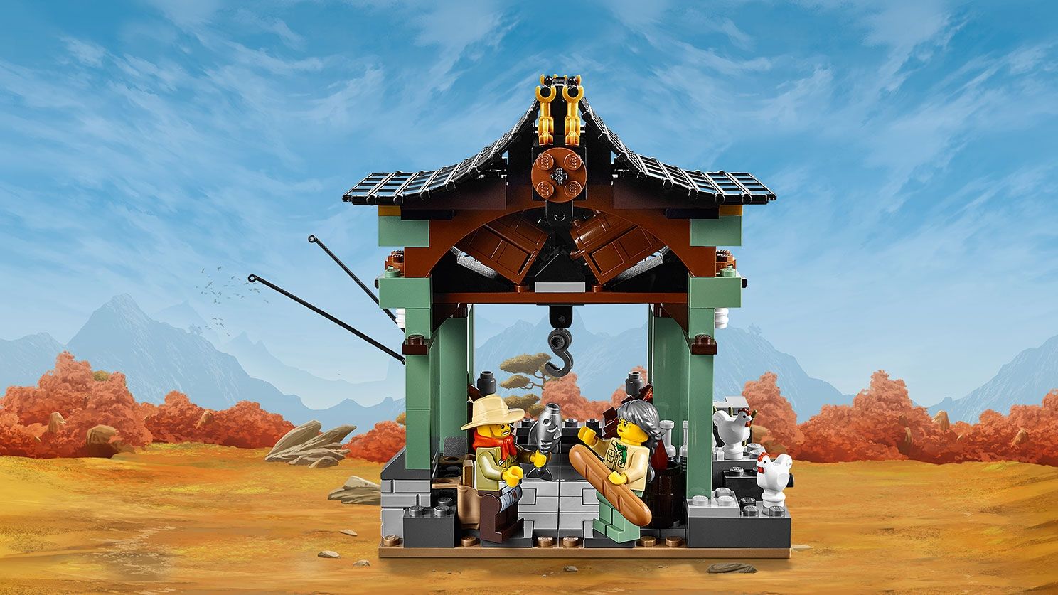 Baue den großartigen Tempel des Airjitzu mit seinem sich drehenden Schattentheater mit Leuchtstein sowie die Schmiede und den Schmugglermarkt!