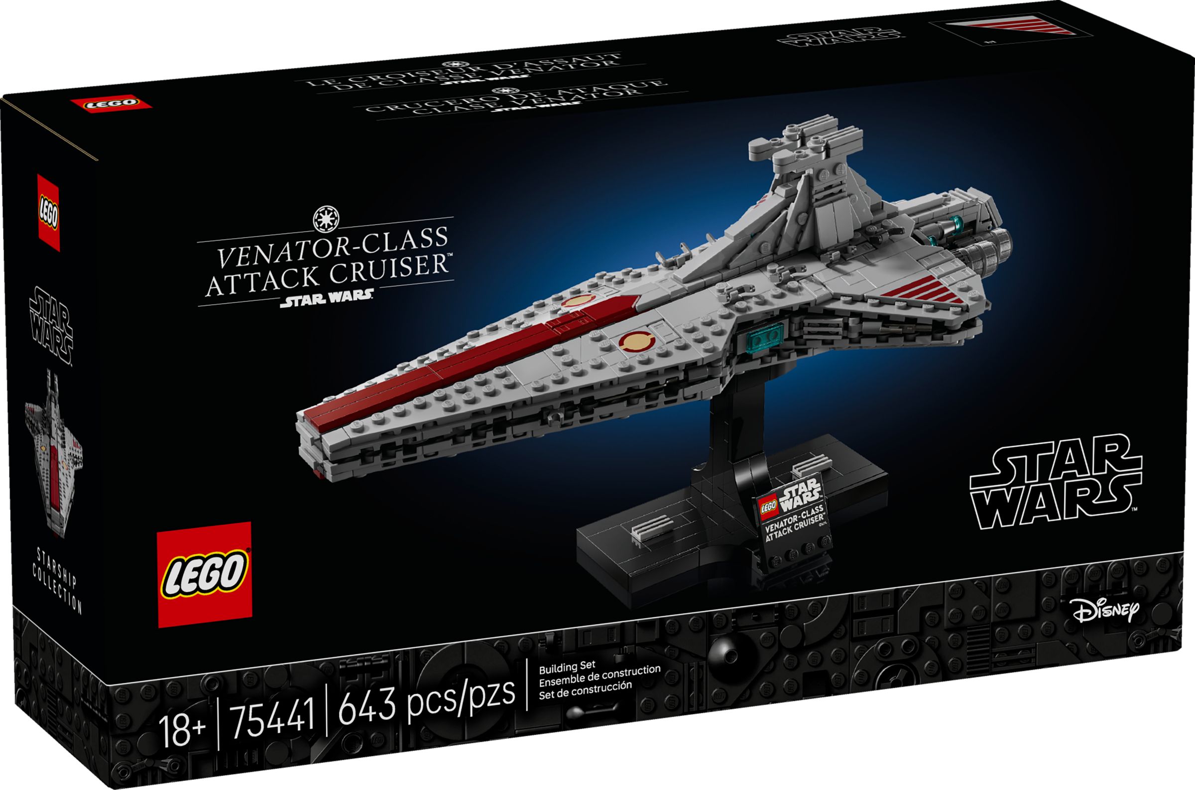 Das LEGO Set Angriffskreuzer der Venator-Klasse mit der LEGO-Nummer 75441 Venator-Class Attack Cruiser™ gehört zur Themenreihe LEGO STAR WARS. Altersempfehlung: 18+ Jahre. Dieser LEGO Baukasten ist 2026 erschienen und wird vermutlich bis 2027 im Programm bleiben. Das Modell besteht aus 643 Teilen. Die Bauzeit beträgt ca. 1 bis 2 Stunden. Designt wurde es von Niels Bundesen. Die Teile des Sets ohne Anleitung und Box wiegen ca. 492 Gramm. Die LEGO-Box wiegt insgesamt ca. 796 Gramm. Die unverbindliche Preisempfehlung (UVP) liegt bei 79,99 €.