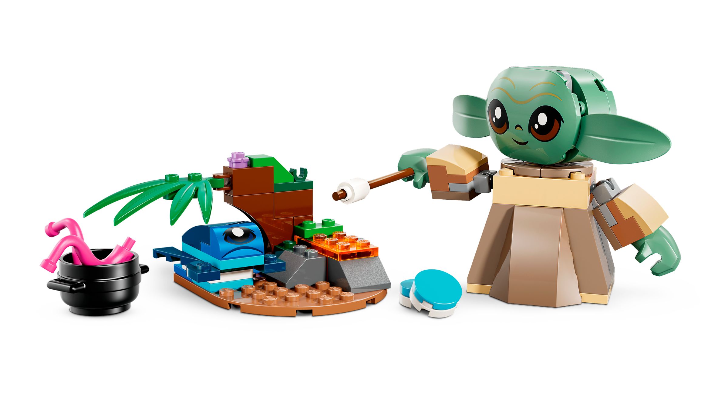 Viel Spaß mit Grogu in seinem Zuhause Bewege Kopf, Arme und Hände der niedlichen Figur. Benutze das Katapult, um den Sorgan-Frosch hüpfen zu lassen! Stell einen Topf auf die Feuerstelle, um Tentakeln zu kochen. Hilf Grogu, einen Marshmallow über dem Feuer zu rösten. Grogu ist noch hungrig? Dann nimm einen blauen Keks!