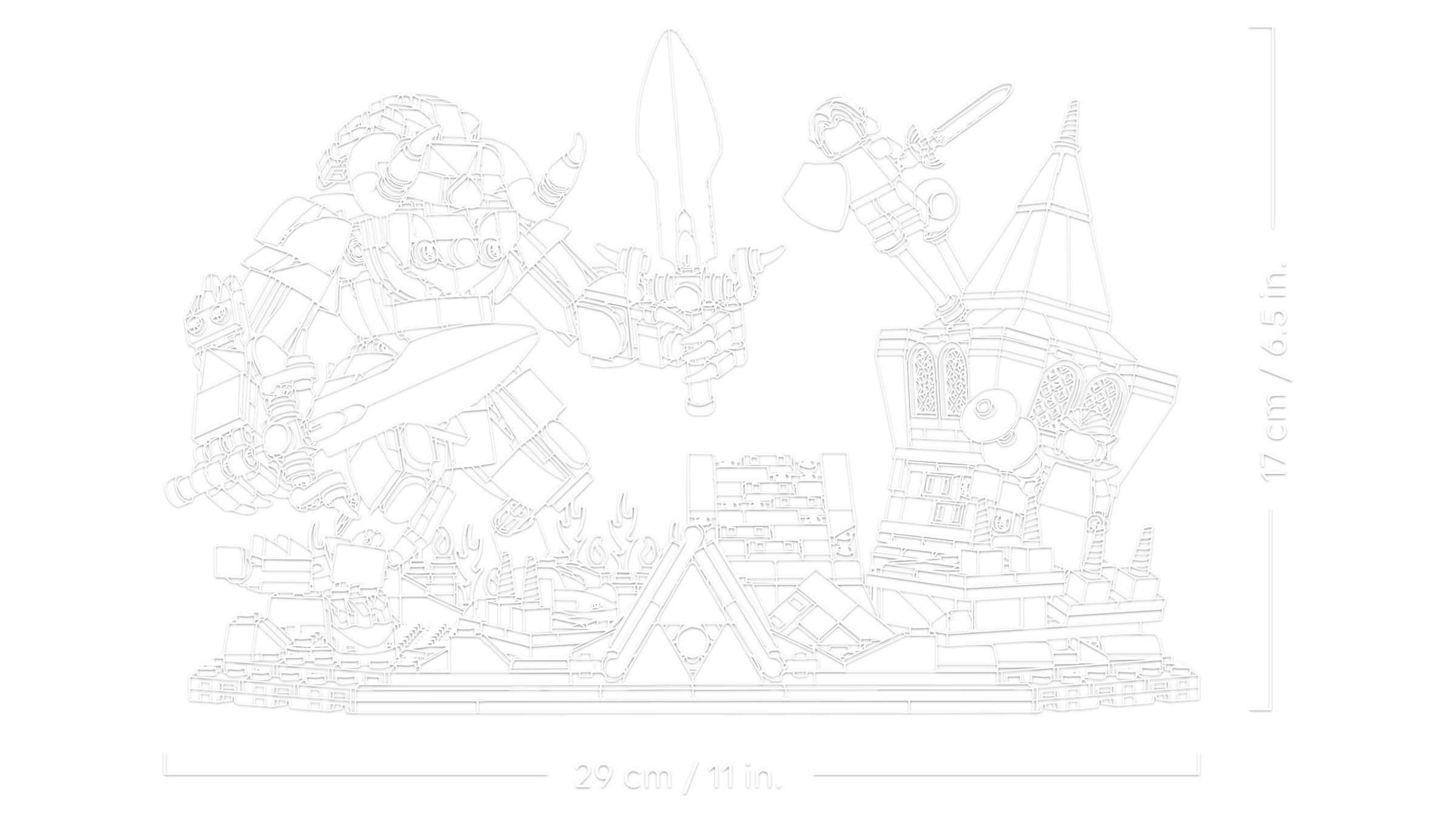 Ganondorfs Enthüllung per Knopfdruck in den Ruinen von Ganons Kastell ist der dramatische Kern dieses Zelda-Dioramas – komplett mit Master-Schwert, Hylia-Schild und der Steinfigur Ganon. Das Projekt umfasst 1.003 Teile, die Minifiguren Link, Zelda und Ganondorf sowie die Fee Navi als transparentes Modell und braucht für Fans ab 18 Jahren etwa zwei bis drei Stunden.