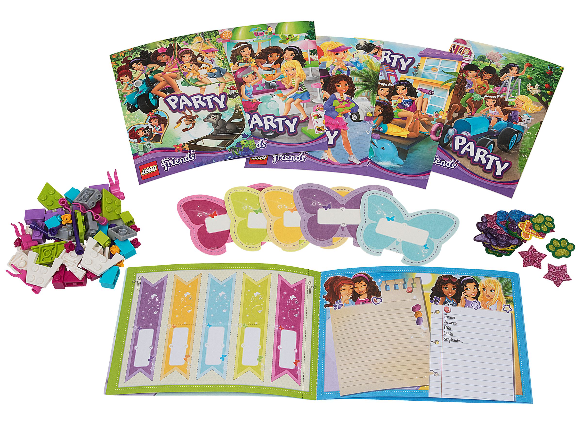 Gib eine perfekte LEGO® Friends Party mit Einladungskarten, Schmetterlings-Namenskarten, baubaren Namenskarten-Haltern und Tischkonfetti.
